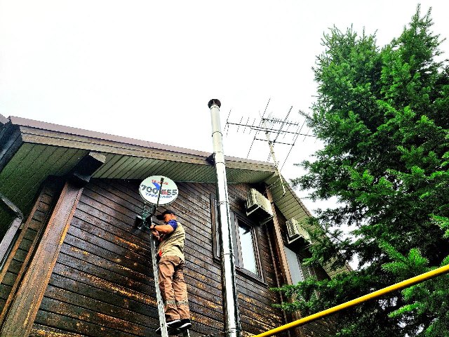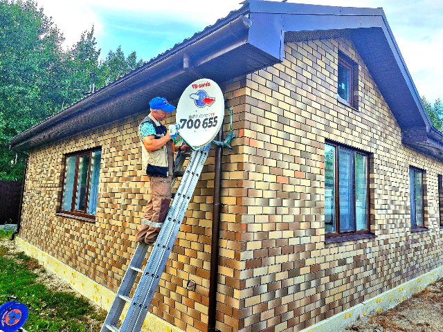 Мастер устанавливает тарелку в выбранной заказчиком точке, с учетом способности точки выдержать вес антенны и ветровые нагрузки. Учитываются также соображения безопасности, оптимальная трасса кабеля и особенности дома.